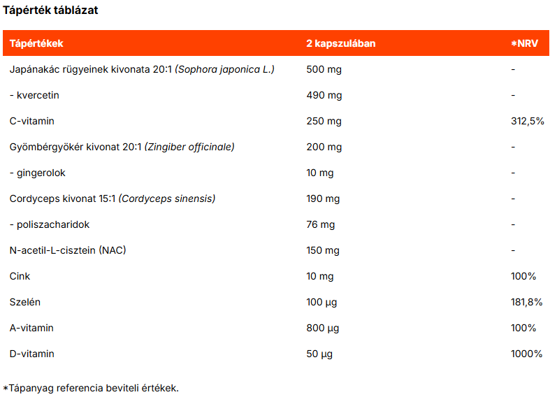 Japánakác rügyeinek kivonata 20:1 (Sophora japonica L.) (98% kvercetin),C-vitamin (L-aszkorbinsav),gyömbérgyökér kivonat 20:1 (Zingiber officinale) (5% gingerolok),cordyceps kivonat 15:1 (Cordyceps sinensis) (micélium) (40% poliszacharidok),N-acetil-L-cisztein (NAC),cink-biszglicinát, L-szelenometionin, tömegnövelő szer (mikrokristályos cellulóz),D-vitamin (kolekalciferol),csomósodásgátló szer (zsírsavak magnéziumsói),A-vitamin (retinil-acetát),hipromellóz kapszula.