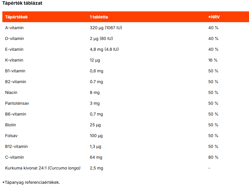 C-vitamin (L-aszkorbinsav),maltodextrin, E-vitamin (DL-alfa-tokoferil-acetát),niacin (nikotinamid),A-vitamin (retinil-palmitát),pantoténsav (kalcium-D-pantotenát),B6-vitamin (piridoxin-hidroklorid),D-vitamin (kolekalciferol),B2-vitamin (riboflavin),B1-vitamin (tiamin-hidroklorid),K-vitamin (filokinon),B12-vitamin (cianokobalamin),folsav (pteroilmonoglutaminsav),biotin (D-biotin),aroma, csomósodásgátló (zsírsavak magnéziumsói),édesítőszerek (szorbit, szukralóz),kurkuma kivonat 24:1 (gyökér) (Curcuma longa) (95 % kurkumin).