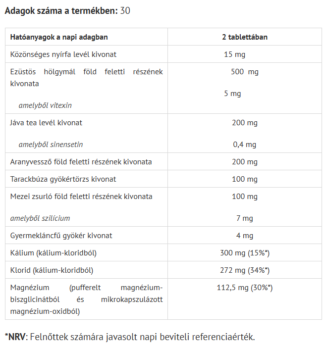 Összetevők: tömegnövelő szer (szorbit),kálium-klorid, ezüstös hölgymál (Hieracium pilosella L.) föld feletti részének kivonata 4:1, mikrokapszulázott magnézium-oxid, aranyvessző (Solidago virgaurea L.) föld feletti részének kivonata 4:1, jáva tea (Ortosiphon stamineus Benth.) levél kivonat 6:1, csomósodást gátló anyagok (zsírsavak magnéziumsói, szilícium-dioxid),tarackbúza [Agropyron repens (L.) P. Beauv.] gyökértörzs kivonat 4:1, mezei zsurló (Equisetum arvense L.) föld feletti részének kivonata 20:1, pufferelt magnézium-biszglicinát, közönséges nyírfa (Betula pendula Roth) levél kivonat 20:1, gyermekláncfű [Taraxacum officinale F.H. Wigg.] gyökér kivonat 20:1.