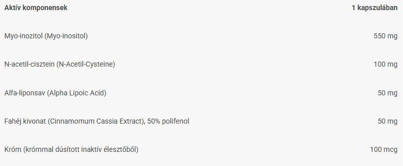 Összetevők : myo-inozitol, zselatin (kapszula),N-acetil-cisztein, alfa-liponsav, krómos élesztő, fahéj kivonat, rizskivonat, L-leucin (aminosav).